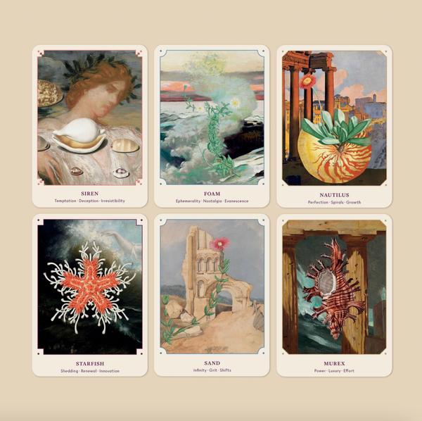 Pick up a shell and put it to your ear. What do you hear? The Seashell Oracle guides oceanic thinking about the past, present, and future through 44 cards and a guidebook for their interpretation. Pull a card at turnings of the tide to consider the currents we’re caught in and the unseen ways we’re linked through the water that flows around and through us all. With original collages made from vintage illustrations by artist Bethany van Rijswijk. Packaged in a beautiful box, with booklet and cards nested inside. Shrink-wrapped.