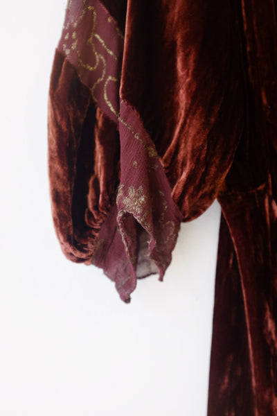 Amber velvet dress with metal embroidery on sheer (likely silk) fabric.